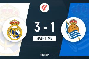 半场-皇马3-1皇社 维尼修斯造点+点射巴尔韦德远射破门贡萨洛建功