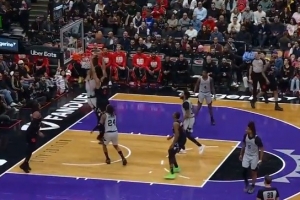 恐怖!文班侧身观察防守突然起跳 单臂大帽巴恩斯势在必得的扣篮