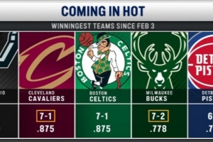 2月3日至今联盟战绩前5球队:马刺骑士绿军雄鹿活塞 今日骑鹿对决