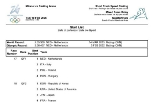体育资讯2月9日讯 2026米兰冬奥会短道速滑混合接力四分之一决赛分组确认,中国和加拿大、比利时、哈萨克斯坦一同分在第三组。