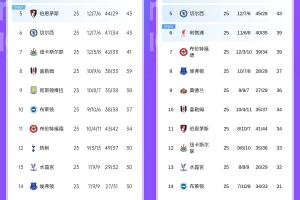 英超前六积分对比上赛季同期:
