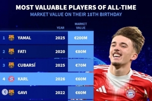 德转列历史18岁球员身价榜:亚马尔2亿领跑,卡尔6000万并列第四