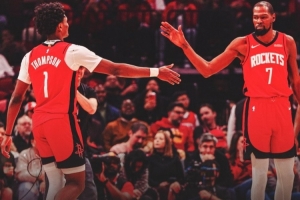 赛后,火箭官方晒出本场赢球海报,封面为杜兰特与阿门·汤普森的击掌瞬间。